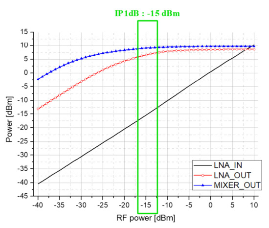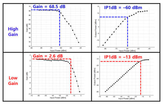 Figure 36 shows the P1dB measurement result of the receiver. In the high gain column of Figure 36, by setting the receiver gain to 68.5 dB, IP1dB of −60 dBm were obtained. In the low gain column of Figure 36, with the gain set to 2.6 dB, it is found that −13 dBm of IP1dB were measured.