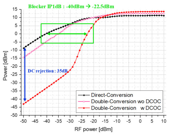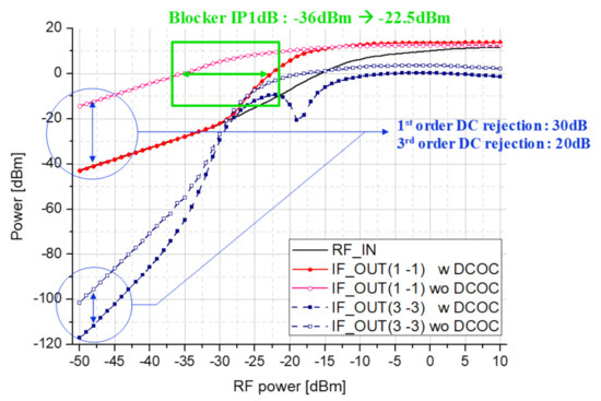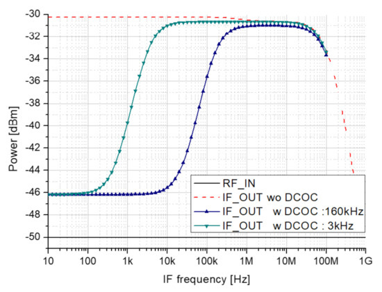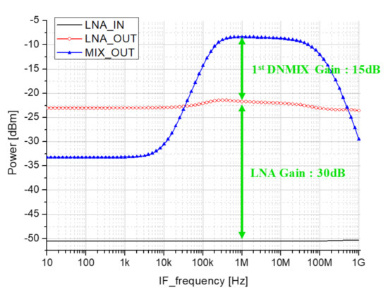 Figure 11a shows that SNR decreases due to the image signal generated in direct down-conversion, and Figure 11b shows the LO leakage and transmission signal generated by the parasitic components of the mixer. This illustrates that DC offset is generated due to TX blocker directly inserted from the transmitter. Therefore, we propose a double conversion receiver and add a DC Offset rejection circuit to suppress the flicker noise.