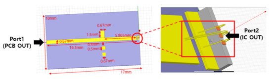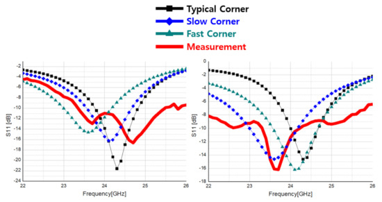Figure 42 compares the measurement result of the transceiver’s S-parameter with the simulation. In the S-parameter simulation, after checking the output impedance by setting the corner variation of the transceiver to Slow, Fast, and Typical Corner, respectively, it was set as the input impedance of the matching circuit to confirm . The transmitter confirms of about −11 dB at 24 GHz, and the receiver confirms of about −10 dB at 24 GHz through simulation.