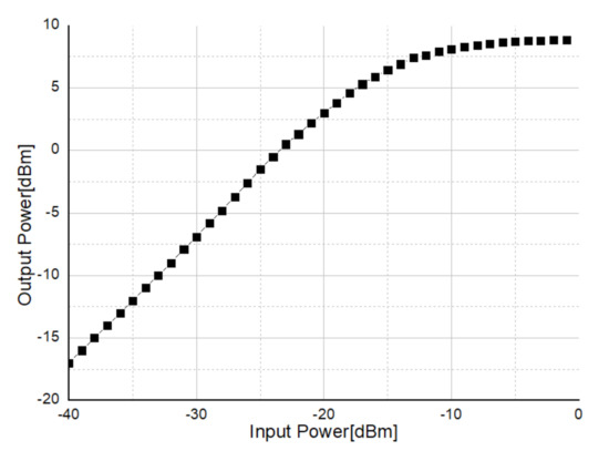 The impedance of the maximum power transfer was confirmed through the power amplifier design. As the impedance seen from the drain of MOSFET used for PA at a specific bias is 62.68 − j50.22, conjugate matching was employed for maximum power transfer. At this time, the small signal impedance of the PA was also checked and matched so that the viewed from the output of the PA could come out below −10 dB, and the simulation result of the maximum output power of about 12 dBm was confirmed.