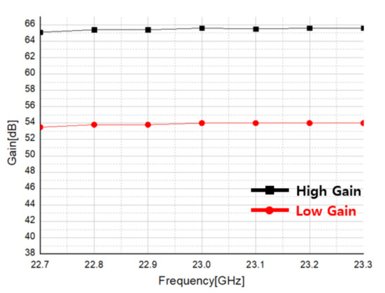 Figure 39 is measured result of the PGA gain of the receiver where the input power is −42 dBm, the LO frequency is 23 GHz, and the LO power is 5 dBm. At this time, the measurement was performed by setting the gain step of the PGA to 6 dB each. From the measurement results, a maximum gain of 68.5 dB was obtained.