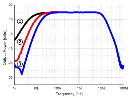 Measurement result of high-pass filter frequency response. Graph ① is the measurement result with only the DCOC of RF TIA on, and shows the cut-off characteristic of 20 dB/dec and 10 kHz. In the graph ②, two DCOCs were turned on, and the cut-off characteristics of 30 dB/dec and 20 kHz were confirmed. Finally, graph ③ was measured with three DCOCs turned on, and showed cut-off characteristics of 40 dB/dec, 20 kHz, and it was confirmed that the Doppler frequency can be detected properly.