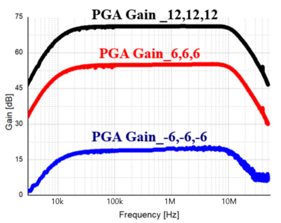 Using Equation (10), the conversion gain of the switching cell of the mixer is calculated, and the final gain considering the TIA can be expressed by Equation (11), and the gain is determined by the on−resistance of the mixer and the feedback resistance of the TIA.