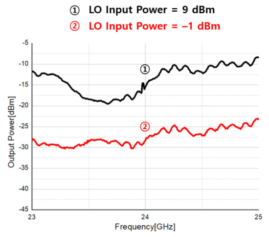 Figure 41 shows the receiver’s LO leakage measurement. The LO leakage of the receiver is measured with the LO power radiated to the input terminal of the receiver through the LNA by applying the LO input power to the 1st down mixer. When the LO input power is 9 dBm and −1 dBm, the LO leakage is measured as −16 dBm and −28 dBm, respectively.