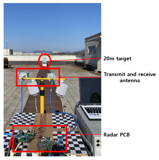 As FMCW mode can only use upstream frequency modulation in the current test environment as shown in Figure 46, speed information cannot be obtained, and a test was conducted to check the distance at which the target is located through the bit frequency according to the distance to the target. First aid kit made of steel with high RCS were placed at about 15 m and 20 m away to check the frequency on the spectrum and converted it into distance to confirm the operation of the FMCW mode.
