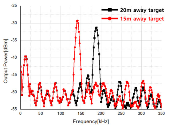 As a result of calculating the distance to the target by substituting the beat frequency of the stationary target into Equation (6), the calculated values of 15 m and 20 m were obtained when the beat frequency was 140 kHz and 186.67 kHz, respectively, as shown in Figure 47. Consistently, it was possible to confirm whether the FMCW mode also works properly.