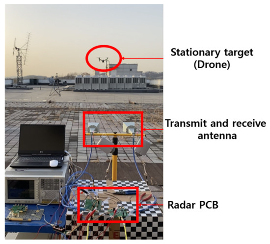 The design requirements for the proposed multi-mode radar transceiver is summarized. The minimum input signal, maximum noise figure, maximum detection distance, frequency modulation bandwidth in FMCW mode, and detection distance according to modulation time are confirmed in Table 2. It can be seen that the RCS is set for a drone [17], and the transmit/receive antenna gains are also obtained by horn antenna manufactured for this work. For a reasonable NF requirement (7∼13 dB for overall receiver), the antenna gain will need to be quite high based on a wide BW leading to sufficient radar detection performance. Moreover, the thermal noise power density at normal temperature is −174 dBm/Hz. As it has a bandwidth of 1 kHz, the maximum thermal noise power density is −144 dBm/Hz. Afterwards, design requirements are verified by measuring the transceiver and testing the radar.