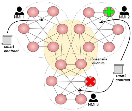 The idea of a decentralized network consists of the fact that each participating organization is responsible for managing, controlling, and maintaining its peers. Figure 1 illustrates this scenario, describing a blockchain network with three independent organizations (in our particular case, NMIs).A quorum formed by peers from each organization is responsible for getting consensus. One can observe that organizations are entirely free to add and remove peers (as the “plus” and “x” icons illustrate) without the need for centralized coordination.Likewise, organizations can add and remove applications, which are represented by smart contracts. Organizations can also share smart contracts, which means they provide the same application.