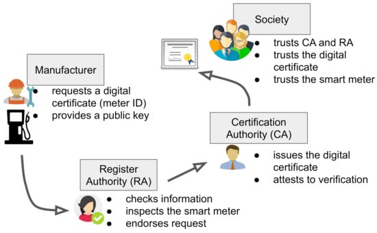 After receiving the meter information validated by the RA, the CA can proceed with issuing the digital certificate. The digital certificate associates the meter with its public key in a manner that is unique and irrefutable. Thus, one can trace any signed measurement to the respective meter. The information has verifiable integrity and authenticity, and no entity can deny its source. The CA issues the digital certificate and sends it to the manufacturer. The manufacturer is responsible for embedding the certificate into the respective meter.