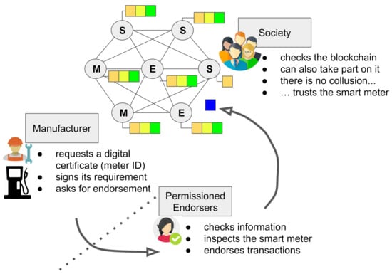 Figure 3 illustrates how the blockchain-based PKI works. First of all, we assume the existence of a consortium among several independent organizations that provide peers (i.e., computers) to integrate the blockchain network. These organizations can represent the interest of Manufacturers (Ms), entities from Society (S), and institutions responsible for assuring the correct behavior of smart meters and endorsing this (Endorsers (Es)). We call this last group Permissioned Endorsers (PEs). Notice that the mentioned classes of organizations are only an illustrative example. We can have many more entities taking part in the blockchain and representing different objectives.