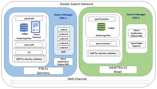 - We implement our inter-NMI blockchain network using the Hyperledger Fabric platform. The implementation integrates servers from PTB and Inmetro in two different managing modes: the direct connection among peers and swarm-based orchestration. We discuss each modes and give directions about managing our inter-NMI network’s eventual growth.