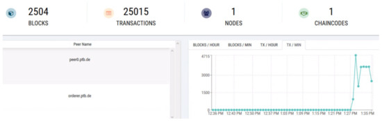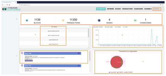 To monitor the blockchain information and our experiment, we used the container-based distribution of the Hyperledger Explorer (https://www.hyperledger.org/use/explorer (accessed on 30 December 2020)) tool. This user-friendly visualization tool helps one see the network information, the number, and the details of blocks and transactions. Individual valid and invalid transaction details and relevant information stored in the ledger can also be seen from the reports, which gradually increase, depending on the test setup. From Figure 5 marked as Section (a–e), the visualization tool Hyperledger Explorer helps us to analyze the following: