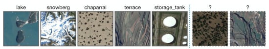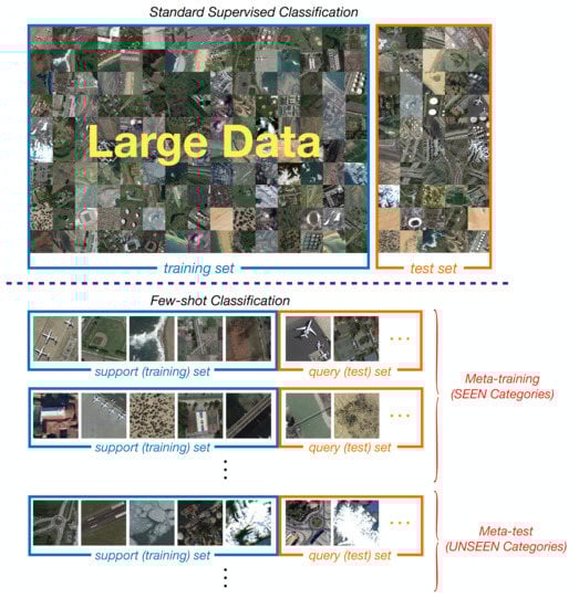 - Alajaji, D.; Alhichri, H.S.; Ammour, N.; Alajlan, N. Few-Shot Learning For Remote Sensing Scene Classification. In Proceedings of 2020 Mediterranean and Middle-East Geoscience and Remote Sensing Symposium (M2GARSS), Tunis, Tunisia, 9–11 March 2020; pp. 81–84. [Google Scholar]