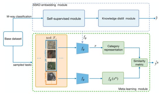 Recently, another line of work has begun to focus on learning richer representations. Zhao et al. [55] proposed a multitask learning framework that combines self-supervised learning and scene classification via a mixup loss strategy that enforces the network to learn more discriminative features without increasing the parameters. Benefiting from the preprocessing of the differential morphological profiles, the work [56] reduces the computation when using differential morphological profiles for classification, which requires relatively few features while achieving the same accuracy. A classification method [57] based on multi-structure deep features fusion (MSDFF) provides another perspective in which the complementarity of features extracted by different CNNs can capture deep features from the image. As pointed out in [58], it remains a discussion of whether rapid learning or feature reuse will lead to state-of-the-art performance. The authors of [58] analyzed MAML [42] and found that feature reuse is the dominant component in MAML’s effectiveness. Inspired by this suggestion, we propose a self-supervised knowledge distillation (SSKD) module that strives to learn a powerful embedding for the downstream meta learner.