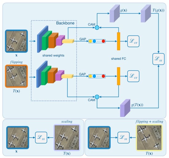 Most of the prior works [61,62] in computer vision weave self-supervision into few-shot learning by adding pretext tasks loss. Predicting the index of jigsaw puzzles and the angle of rotations are among the most effective pretext task choices. The most important FSL benchmark in computer vision is miniImageNet [38], whereas RS scene datasets have their characteristics. For example, for an image of a dog, the most discriminative part of the image changes when flipping or rotating it. However, RS scene images may lack this crucial discriminative information because many natural objects (e.g., forest, desert, ocean, and so forth) have fractal properties [63]. Taking this in mind, we propose a novel two-branch network that takes pairs of original-transformed images as inputs and incorporates CAM [60] to force the network to mine the most relevant category-specific region, shown in Figure 6.