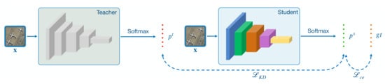 Let and denote the logits that input pass through the teacher and the student networks, respectively. We freeze the teacher network’s weights and train the student one by minimizing the combination of two loss function terms. Define as the cross-entropy loss between the student predictions and ground-truth labels, and as the Kullback–Leibler divergence (KL) loss between the teacher and the student predictions. Then, the combined loss function is: