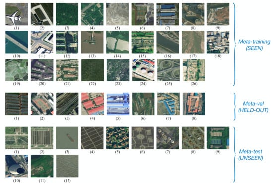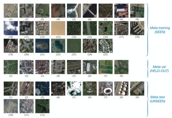 In the NWPU-RESISC45 dataset, there are 45 categories, each of which has 700 images with a size of pixels. This dataset was proposed in 2017 by Cheng et al. [22]; the RS scene images in it are extracted from Google Earth by experienced experts. The spatial resolution of most scene categories ranges from about 30 to 0.2 m per pixel, except for some categories that have lower spatial resolutions, e.g., island, lake, mountain, and snow-berg. Following the split setting proposed by Ravi et al. [39], we take 25 of 45 categories for meta-training, 8 for validation, and 12 for meta-test, as detailed in Figure 8. Namely, a model is trained on many N-way K-shot tasks sampled from the 25 SEEN categories during the meta-training stage. The best model is chosen based on the few-shot classification performance over eight HELD-OUT categories of Meta-val. This best model is our final model, which is tested on the UNSEEN set Meta-test.