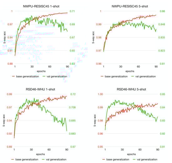 We verify the effectiveness of the proposed RS-SSKD method on two datasets, NWPU-RESISC45 [22] and RSD46-WHU [34]. The same evaluation protocol is used over all the experiments. Following the prior work [38,39,40], the tasks between meta-training, meta-validation, and meta-test should be in the same configuration. For example, in the 5-way 1-shot scenario, a task includes five categories (way), each category with only one support samples (training data), along with 15 query samples to be classified (test data). We keep sampling the 5-way 1-shot tasks from SEEN categories during meta-training. The tasks drawn from the meta-val categories (HELD-OUT) are used for selecting the best model. The model generalization accuracy in the meta-learning stage is shown in Figure 10, where the best model may appear at the epoch corresponding to the peak of the green line. Once the meta learning stage is done, the best model is applied to those tasks sampled from meta-test (UNSEEN) categories for evaluation. The same protocol is used for the 5-way 5-shot case. Note that, in the standard FSL setting, the meta-test tasks arrive one at a time, not simultaneously. In other words, we record the accuracy when every task comes and compute the mean accuracy over many tasks, with a 95% confidence interval.