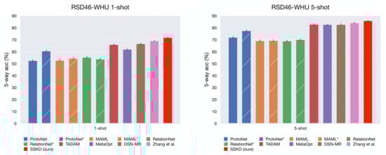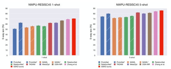 In addition to the training time of the meta-training stage, like Zhang et al. [50], our method has an additional training time for the pre-training stage, which is the runtime of our SSKD module. The pre-training runtime of [50] is 1.6 h on NWPU-RESISC45 and 2.2 h on RSD46-WHU. The training time of our SSKD module is including two parts, the runtime for the self-supervised network and the KD procedure. It cost 3.9 h and 6.3 h to train the proposed self-supervised network on NWPU-RESISC45 and RSD46-WHU, while the KD procedure takes 2.5 h on NWPU-RESISC45 and 2.8 h on RSD46-WHU, respectively. That is, the training time of our SSKD module is 6.4 h and 9.1 h in total on NWPU-RESISC45 and RSD46-WHU, respectively. The same as in work [50], we do not introduce any extra parameters but optimize the embedding directly by the cosine classifiers over the N-way K-shot tasks in the meta-learning stage. Our meta-training runtime is nearly the same as work [50], slightly more than ProtoNet and RelationNet with a ResNet-12 backbone. Counting in the training time of the SSKD module, our approach achieves the best performance at a modest increase in total training time. Note that our SSKD module only needs to train once on a dataset to provide a powerful embedding for downstream meta-learners under arbitrary N-way K-shot setting.