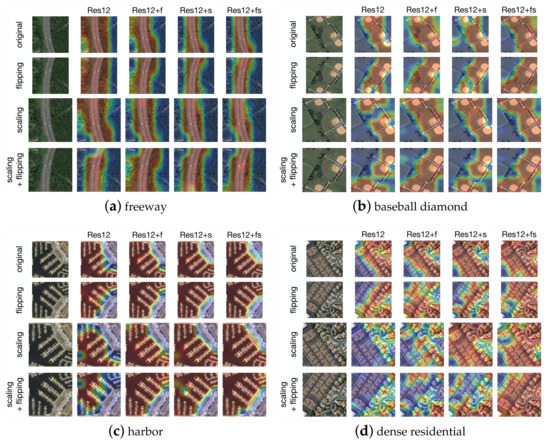 To verify that our proposed self-supervised network refines the class activation maps (CAMs), we compare the visualization results generated from the original, flipped, and scaled inputs for the same label using the baseline model (Resnet-12) and the proposed network. Using the proposed self-supervised network that enforces the attention consistency (AC) [64] under the three image transformed pairs, we get the trained models: Res12+f (flipping), Res12+s (scaling), and Res12+fs (flipping and scaling), respectively. Figure 14 shows four examples of CAMs for the labels (a) freeway; (b) baseball diamond; (c) harbor; and (d) dense residential. The CAMs from the baseline model Resnet-12 are either inconsistent or contain non-target parts, e.g., it covers a lot of the forests on both sides of the freeway under both the vertical flipping and scaling transformations. Our Res12+f model generates highly consistent attention regions under image flipping but failed under image scaling and flippling+scaling. The Res12+s model produces highly inconsistent CAMs under image flipping and scaling+flilping, especially in the cases (b) baseball diamond and (d) dense residential. Considering attention consistency under both flipping and scaling, the model Res12+fs outputs highly consistent CAMs under all cases except slightly inconsistent under image scaling and flipping in (d), but still better than others. These qualitative results illustrate that the proposed network can generate the most relevant category-specific regions by enforcing attention consistency under original-transformed pairs.