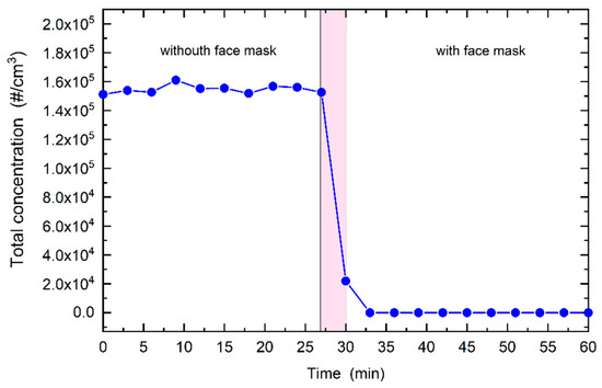 where is the total concentration, when the mask is on the head manikin, and is the average total concentration without the mask. was determined from the third measurement as it took approximately 6 min for the particle concentration to stabilize inside the chamber.