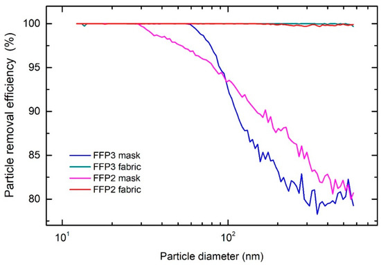 Particle removal efficiency as a function of particle diameter for the FFP2 and FFP3 respiratory masks and their fabrics.