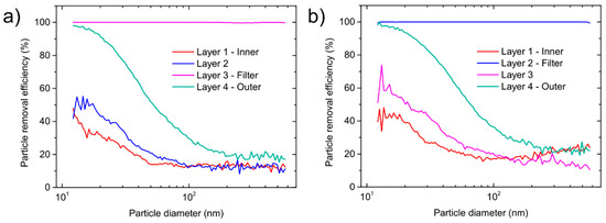 Particle removal efficiency as a function of particle diameter for single layers: (a) FFP2 mask; (b) and FFP3 mask.
