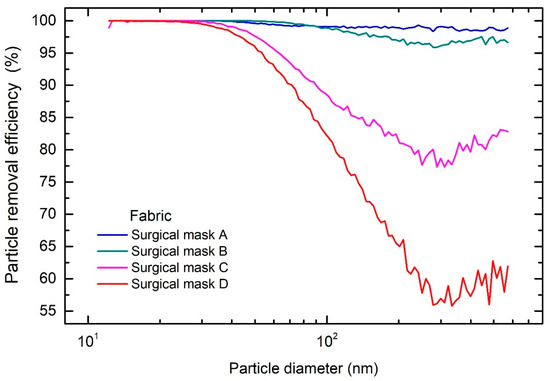 The measured overall PRE of the masks shows similar size-dependent particle removal efficiencies, as shown in Figure S5. The overall PRE for the surgical masks donned on the head manikin was between 65% and 80%. Surgical masks do not provide a good fit on the face [28], unlike FFP2 and FFP3 masks. Therefore, only the PRE of their fabrics was investigated, cf. Figure 5 for details. Fabric of mask A, which was composed of four layers, had the highest overall PRE of 99.5%. As seen from Figure 5, the fabric filters out most of the particles in the measured range, and has a comparable performance to the fabric of the FFP2 and FFP3 masks. Similarly, the fabric of mask B had the overall PRE of 99.4%. For the fabric of mask C, the overall PRE was 94.6%, which is in compliance with the lower standard class of the surgical mask [13]. The fabric of mask D had the lowest overall PRE of 91.5% and therefore should be used with caution, especially in high-risk environments.