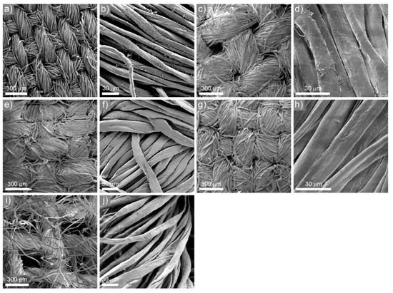 SEM images of: (a,b) Poplin A; (c,d) Poplin B; (e,f) Poplin C; (g,h) Poplin D; (i,j) Tetra.
