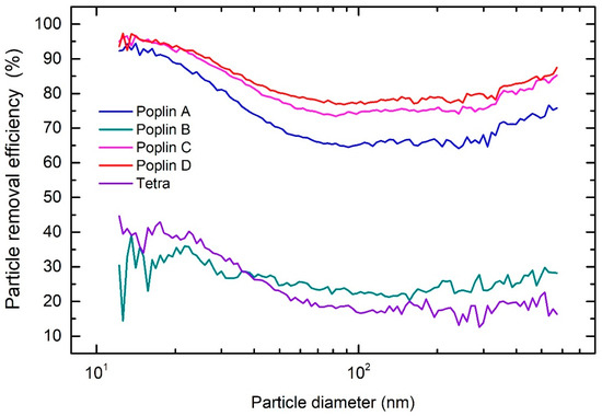 The overall PREs of five cotton fabrics in comparison with FFP2, FFP3 and surgical masks are shown in Table 2. The overall PRE of A, C, and D poplin fabrics was over 70%, while for poplin B and tetra the PRE was below 30%. As can be seen from Table 2, one cannot infer the PRE from the fabric weight alone—the structure of the fabric and the size of the fibers are more important than the weight. The A, C, and D poplin fabrics have a similar size-dependent PRE, as shown in Figure 7. The PRE starts to decrease for particles larger than 20 nm, and drops down to 65% for fabric A. PRE is the lowest for particles between 100 nm and 300 nm, which is expected, as these particles are more difficult to filter from the air due to the large diameter of the fibers and lack of any static charge on the fibers. For poplin B and the tetra fabric, the overall PRE is considerably lower due to large pore sizes, as seen in Figure 6c,i), enabling aerosol particles to pass unhindered through the material. In contrary, the threads form a tight mesh in the A, C, and D poplin fabrics forcing the aerosol particles to pass between the fibers, increasing the probability of their deposition onto the surface of fibers or getting stuck between them. Although the overall PRE for the presented fabrics is lower than that of FFP and surgical masks, some textiles appear to provide a suitable level of protection for the general public.