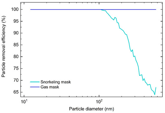 The overall PRE of the gas mask was the same as that of the breathing filter, indicating that there was no leakage. The snorkeling mask equipped with the breathing filter had an overall PRE of 96.8% which indicates some air leakage. This is evident from the size-dependent PRE graph, shown in Figure 8. The PRE for the modified gas mask is essentially 100% for all particle sizes, while for the modified snorkeling mask the PRE starts to drop at 100 nm and drops down to 65% at larger particle diameters, Figure 8. Although the overall PRE for the modified snorkeling mask is similar to a FFP2 mask, it should not be used in high-risk environments, as it does not provide suitable protection.