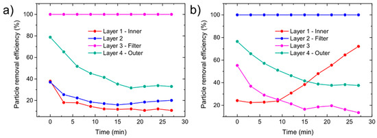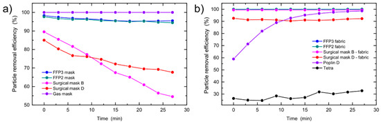 Particle removal efficiency (PRE) as a function of time: (a) FFP2 filtering material and (b) FFP3 filtering material.