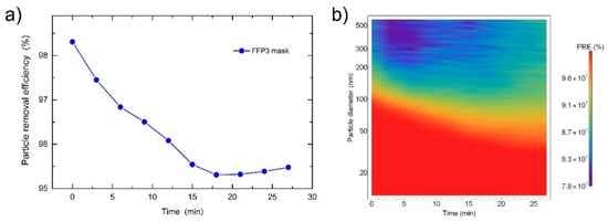 (a) Particle removal efficiency (PRE) as a function of time and (b) PRE given as a particle diameter in log scale vs. time of measurement plots for the FFP3 mask.