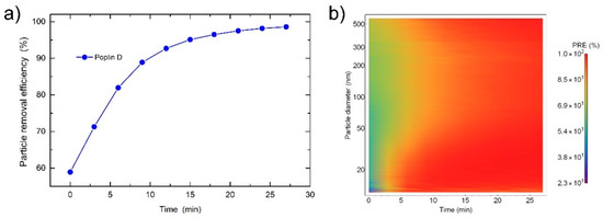 (a) Particle removal efficiency (PRE) as a function of time and (b) PRE given as a particle diameter in log scale vs. time of measurement plots for the Poplin D fabric.
