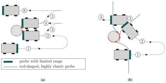 Mobile robots equipped with tactile sensors exploring using different probes to explore their environments: (a) robot with a dual switch or a skin-like sensor with limited range—(1) robot passing the object without sensor contact, (2) first collision with the object leads to the detection of a single discrete point, (3) moving backwards/ repositioning, (4) second collision with the object leads to the detection of a second discrete point, (5) see (3), (6) obstacle avoidance completed; (b) robot with a rod-shaped, highly flexible sensor—(1) passing the object witch continuous sensor contact (detecting a sequence of contact points), (2) using information from (1) for making the next contact, (3) wall-following from (2) to (3) by keeping the signals constant, (4) obstacle avoidance completed.