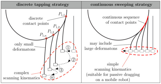 One common drawback of all tapping approaches is that they require actuators for both making tapping movements and repeatedly changing the position of the rod relative to the object in order to achieve the complex scanning kinematics, see Figure 2a. Such a complex approach, imitating the head and vibrissae movements of a rat, is described in [18]. However, the sweeping scanning strategy dispenses with the need for various actuators, due to the fact that sweeping can be realized passively. For example, if a mobile robot equipped with a highly flexible artificial vibrissa passes an object, the robot movement itself causes the artificial vibrissa to slide along the object, consequently providing a whole sequence of contact points, see Figure 1b. One positive side effect of using a highly flexible rod is its robustness against collisions and the ability to bend out of the way when accidentally making contact with an obstacle. Despite these advantages, the sweeping strategy has received much less attention in the literature. In [19], a super-elastic nitinol wire was swept along an object using a DC motor. The support reactions at the base of the wire were measured using a hub load cell and used to repeatedly reconstruct the entire shape of the wire, finally making the 2D contour of the scanned object apparent. In [20,21], the problem of sweeping a rod along 2D objects was treated analytically. Beyond object reconstruction, the focus was on simulating scanning sweeps and generating the support reactions theoretically. As in [19], nonlinear Euler–Bernoulli theory was used for describing the large deformations of the rod. An alternative reconstruction method was presented in [11]. The algorithm is based on repeatedly inferring from one contact point to the next one by continuous measurement of the moment and rotation angle at the base of the rod. One major advantage of this method is that no force measurement is required, consequently reducing the size of the sensors. Furthermore, the contact points are determined by solving algebraic equations, instead of numerically integrating the deformation equations of the rod, which greatly reduces computational time. However, the method is limited to tangential contacts along the length of the rod. Tip contacts, which are likely to occur in real-world problems, lead to large reconstruction errors. In addition, it requires an active movement and was never extended for scanning 3D objects.