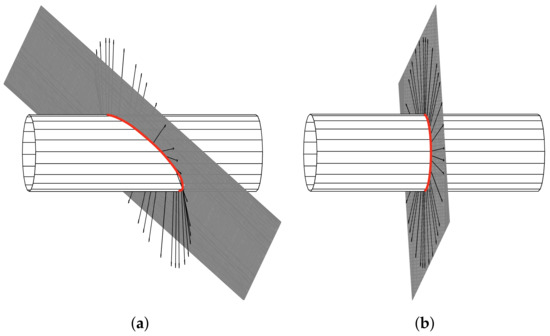 The scanning plane (gray) intersects the cylinder in a curve (red line). For a special arrangement of the scanning plane relative to the object, the surface normals at each point of the intersection curve lie within the scanning plane, see Figure 3b. Under these conditions, the scanning sweep entirely takes place in a plane due to the fact that, in the absence of friction (ideal contact), the contact force between the rod and the object coincides with the normal vector at the contact point. However, it is clear that these special conditions are practically unlikely to occur and can only be ensured if the orientation of the scanned object is a priori known. This may be the case for some test stands or prototypes as, e.g., presented in [22], but not in a real-world scanning scenario. For the latter, it is much more likely that the rod makes contact with the object in some random orientation and, therefore, bends out of the scanning plane. In addition, real-world objects might be shaped in such a complex way that, even, if the orientation of the object was known, the special case, shown in Figure 3b, cannot be achieved without actively adjusting the scanning direction. To sum up, using 2D models for object scanning greatly limits the practical applicability.