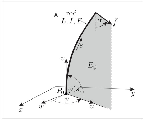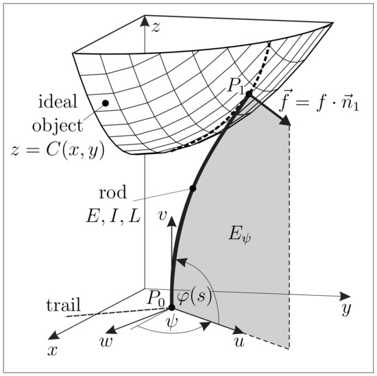 For a given clamping position , only those points of the prescribed surface C, that fulfill Equation (16), are optional contact points. Using Euler’s constitutive law, the plane deformation of the rod is described by the following system of ordinary differential equations (ODE), where s is the natural coordinate arc length, is the slope of the rod’s axis and is the curvature of the rod [20]: