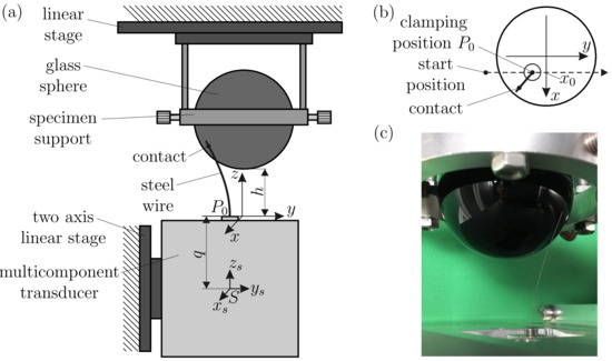 The object distance h was limited by a minimum value of 25 mm to avoid collisions of the wire with the specimen support and to avoid the plastic deformation of the wire. A maximum distance of 45 mm was chosen to ensure a sufficient deformation of the wire. Varying the parameters h (25 to 45 mm, step-size: 5 mm) and (−13 to +13 mm, step-size: 1 mm), resulted in a total of 135 performed scanning sweeps, each lasting 74 seconds. Depending on the object distance h and the scanning trail, the sweeps either included tip and tangential contacts or only tip contacts. For lower object distances, most sweeps started with a phase of tip contacts, which at some point turned to a phase of tangential contacts and finally returned to a tip contact phase before the wire detached from the sphere. Lateral slip occurred during all experimental scanning sweeps. Longitudinal slip only occurred for some special cases, namely at the beginning of those scanning sweeps with . In addition, for all scanning sweeps, axial slip occurred when the rod was in tangential contact with the sphere. During object scanning, the set of six support reactions at the base of the wire were measured in the -coordinate system (see Figure 5) with a sampling rate of 40 Hz. The measured data were filtered by a moving mean of 10th order. Since the clamping position of the wire was shifted from the center S of the transducer by the distance 73.5 mm (see Figure 6a), the measured signals were corrected in the following way: