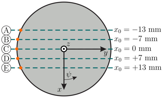Since the arrangement of deformation states is symmetric, the blue configurations might also be interpreted as an ideal backward sweep in negative direction of y. It can be seen that for most clamping positions, except for those exceeding the area below the sphere, there are two configurations (orange and blue) as already observed analyzing Equation (28). However, from a physical point of view, it is impossible that, e.g., scanning sweep C starts with a blue configuration due to the scanning direction from left to right. This raises the question, at which point of a real-world scanning sweep, the rod might snap from an orange to a blue configuration. Therefore, the elastic deformation energy