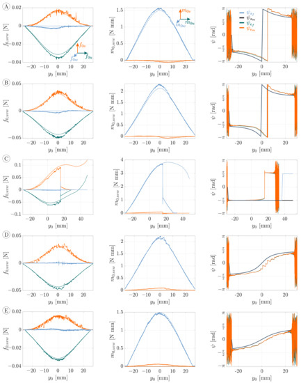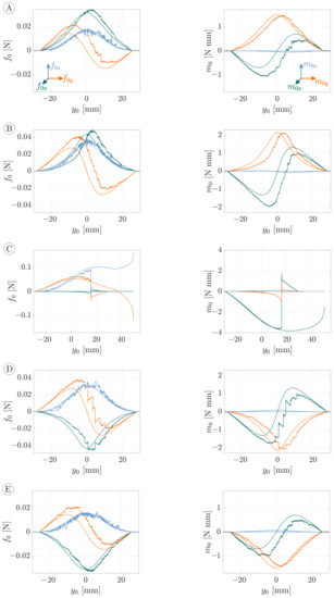 In doing so, the angle was calculated using the support reactions and exploiting Equation (23). The reaction forces (green), (orange) and (blue) during the scanning sweeps A–E are shown on the left side, the reaction moments (green), (orange) and (blue) in the middle and the orientation angle of the deformation plane on the right side of Figure 11. Theoretically, the components , and are zero due to the plane bending assumption. The experimental data of these components show only a slight deviation from the theoretical values.