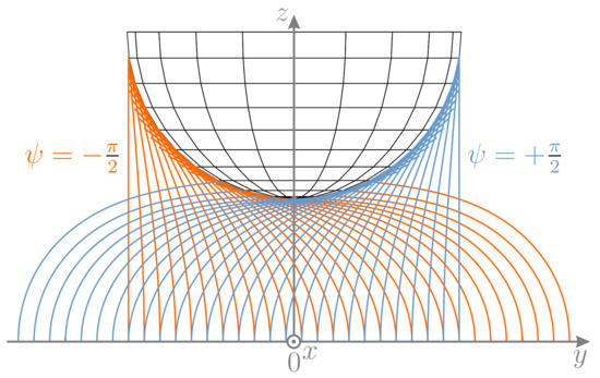 Both arguments of Equation (28) have the same sign, if and differ in sign if . Depending on , the term can accept positive or negative values. Therefore, according to the definition of atan2, there are two solutions and for each clamping position except for , where the second argument of Equation (28) is not defined. This indicates that, except for , there might be two possible equilibrium states of the rod. For the entire scanning sweep C the second argument of Equation (28) is zero, resulting in two possible orientation angles and of , according to the definition of atan2. Due to the principle of minimum energy, it can be expected that the lower potential energy state has a preferential appearance in reality. However, the simulation algorithm proceeds by using the parameters of the previous deformation state as initial values for determining the subsequent deformation state. Therefore, the numerical algorithm always finds that solution, which is the most similar to the previous one and not necessarily that one that minimizes the potential energy. For that reason, the orientation does not change during simulation. It can be expected, that, in an ideal world without any disturbance, sweep would occur without a jump, just as observed in the simulation. In practice, however, has never the exact value of zero due to minimal deviations. These deviations, however minor, might cause the rod to snap from one to the opposite side of the sphere, jumping from a higher to a lower energy state. In Figure 10, an ideal scanning sweep C (orange: ) is outlined and overlaid with the alternative solutions (blue: ).
