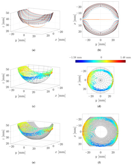 Figure 12c,d show the reconstructed points based on the measured data of 27 scanning sweeps ( mm) superimposed with the original object surface. The color of each point denotes the reconstruction error in mm, which is defined as the closest distance between the point and the object surface. The error is directly evident from the color bar in Figure 12d. It can be seen that the maximum reconstruction error after expunging the outliers is 1.58 mm or approximately 3.2% of the wire length. A positive sign of the reconstruction error indicates that a contact point is outside and a negative sign that it is inside of the original object. Having the scanning direction in mind (positive y-direction), it is obvious that positive errors occur, especially at the beginning and the end of the scanning sweep, when the deformation of the wire is small. These errors are not surprising, since small wire deformation results in a bad signal to noise ratio. Negative errors increasingly occur as the wire bends in the x-direction. In Figure 12d the outer reconstructed sequences seem fairly axial symmetric with respect to the x-axis. In addition, the pairwise arrangement of sweeps with the same lateral displacement are symmetrical to some extent. However, it is striking that the reconstruction error seems asymmetric in the sense that negative errors are greater for . Figure 9 has already shown that the support reactions resulting from scanning sweeps with (sweep D and E) were more affected by stick-slip effects, which probably cause the asymmetry of the reconstruction error. The jump of the rod from one side to the opposite side of the sphere during scanning sweep C is apparent, looking at the innermost sequence of reconstructed contact points, which start at . At the beginning of the scanning sweep, all contact points approximately lie in the x-z-plane, which indicates that only longitudinal slip occurred. Subsequently, the contact point begins to move slightly laterally in a x-direction. Finally, the sequence of contact points breaks off due to the jump of the rod to the opposite side of the sphere. It is interesting that this behavior is not only apparent for the innermost scanning sweep but also for some sweeps with a small lateral displacement . This could be related to the large distances between the reconstructed points when simulating scanning sweeps with a small lateral displacement .