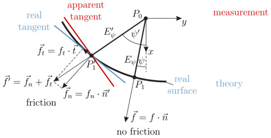 Perhaps surprisingly, the distortion in the -direction between the simulated and measured data in Figure 9, which is presumably friction-induced, does not appear to affect the outcome of the object reconstruction. As the color bar shows, there is no significant distortion between the reconstructed points and the original object. In order to understand this result, the effect of friction during object scanning is analyzed in more detail. One key assumption of the mechanical model is that the scanning sweep takes place in the absence of friction. Therefore, in theory, the contact force is always orientated in direction of the outward-pointing normal vector of the object surface—see Figure 13.