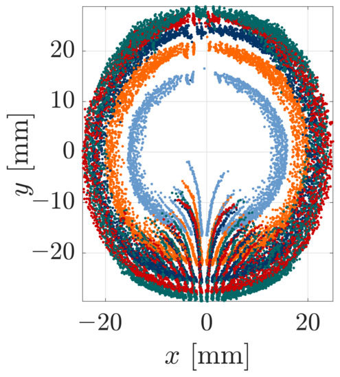 Each reconstructed sequence of contact points resulting from a single simulated sweep is connected with a line. The colors of the points are arbitrarily chosen and are solely aimed for an easy distinction between adjacent contact point sequences. As the theoretical results indicate, object scanning using a single object distance is sufficient to provide a variety of contact points, approximating the shape of the sphere. However, there is a large gap in the reconstructed area. It is crossed by the reconstructed sequence of contact points resulting from the special scanning sweep C (). The theoretical reconstruction errors of all points are negligible (within the numerical boundaries). The symmetry of the support reactions (see Figure 9) reappears in the reconstructed sequences of contact points, which are axially symmetric with respect to the x-axis (except that resulting from scanning sweep C ending with a snap-off). In addition, those contact sequences resulting from scanning sweeps with the same distance from the coordinate origin are symmetrical in pairs, with respect to the y-axis. Having in mind that the step-size for the displacement of the clamping position is constant for all simulations, it is important to note that the reconstructed points are not equidistantly distributed. Instead, the distances between the points increase in the middle of each sequence—see, e.g., Figure 12a (blue). This effect is reinforced the closer the scanning trail is to the coordinate origin, i.e., the smaller . In particular, this is evident in the innermost sequences, which narrows the reconstruction gap. Even though the presented mechanical model is a quasi-static one, this fact may be a hint at the contact point velocity during scanning. It can be expected that the ratio between the displacement of the contact point and the displacement of the clamping position might be the same as that between the contact point velocity and the clamping velocity. Thus, greater distances between the reconstructed points might be interpreted as higher contact point velocities. This is consistent with our observations during the experiments: the contact point starts moving slowly and gets increasingly fast in the middle of the scanning sweep until it finally slows down again.