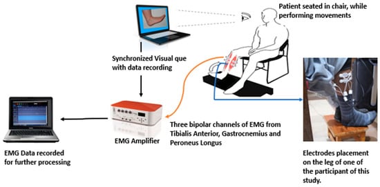 An illustration of the electromyography (EMG) data recording setup while the patient was performing movements.