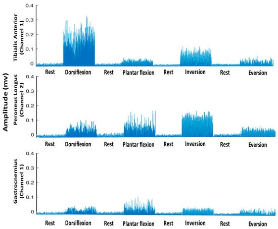 The results of this study related to motions classification and the association between level of motor impairment and its effect on performing ankle joint movements are summarized in Table 2 and in Figure 2, Figure 3, Figure 4, Figure 5, Figure 6, Figure 7 and Figure 8. As studies have reported differences in EMG signals on the basis of sex, age, and anthropometric variables; therefore, the results of this study are not representative of the whole population [].