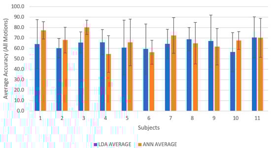 A column graph representing the average classification accuracies for all subjects using linear discriminant analysis (LDA) and artificial neural network (ANN) reported in the form of mean ± standard deviation.