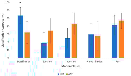 The average classification accuracy for all motion classes across all participants. The results are reported as mean ± standard deviation and asterisk denotes significant differences between motion class for each classifier. The asterisk denotes statistically significant difference.