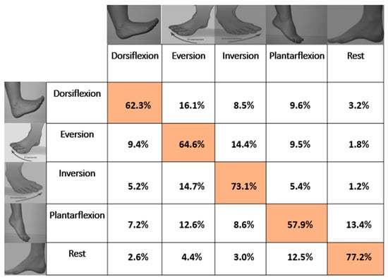 On average across all participants, 63.85% ± 4.2% and 67.09% ± 7.8% of the movements were accurately classified in the offline analysis using LDA and ANN, respectively. One-way repeated measures of analysis of variance (ANOVA) revealed a significant difference between motion classes for both LDA ((F (4, 40) = 12.48; p < 0.001; partial η2 = 0.55) and ANN ((F (4, 40) = 3.57; p < 0.001; partial η2 = 0.26). For LDA, the post-hoc test with Bonferroni correction for multiple comparisons revealed that dorsiflexion was significantly different from eversion, inversion, and plantar flexion. Additionally, using LDA, dorsiflexion was the easiest to discriminate (83.6%). The accuracies of the other motion classes were in the range between 48% and 72%. The accuracies of dorsiflexion and the rest class were higher than all other motion classes, while the accuracies of plantar flexion and inversion were higher than that of eversion. The confusion matrix in Figure 5 shows that rest and eversion were mostly confused by LDA. In the classification using ANN, rest was classified most accurately with an accuracy of 77.1%, and plantar flexion had the lowest accuracy of 57.9%. For ANN, the post-hoc test with Bonferroni correction for multiple comparisons revealed that dorsiflexion was significantly different from rest.